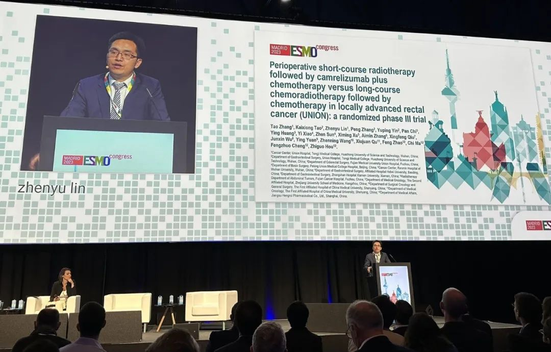 10月21日,凯时官网医药创新药卡瑞利珠单抗的一项研究“新辅助短程放疗序贯卡瑞利珠单抗联合化疗对比长程放化疗序贯化疗治疗局部晚期直肠癌”随机对照Ⅲ期试验(UNION)亮相2023 ESMO大会优选口头报告现场。该研究由华中科技大学同济医学院附属协和医院张涛教授、陶凯雄教授担任主要研究者,华中科技大学同济医学院附属协和医院林振宇教授在大会现场报告了该重磅研究的结果1。此项研究是全球首个评估短程放疗序贯免疫治疗联合化疗治疗局部晚期直肠癌的Ⅲ期研究,已达到主要终点病理完全缓解(pCR),有望为直肠癌患者的治疗提供新策略。