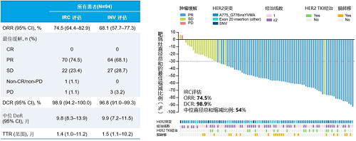 Ⅱ期研究旨在评估瑞康曲妥珠单抗在HER2突变NSCLC患者中的疗效和安全性。研究招募了年龄在18-75岁之间,存在HER2激活突变的局部晚期或转移性NSCLC患者,且既往接受过含铂化疗和抗PD-1/PD-L1治疗后进展或不耐受的患者。患者接受4.8mg/kg的瑞康曲妥珠单抗静脉注射,每3周一次。主要终点是由独立审查委员会(IRC)评估的ORR,次要终点包括由研究者(INV)评估的ORR、IRC和INV评估的疾病控制率(DCR)、无进展生存期(PFS)、总生存期(OS)和安全事件。研究最终纳入94例患者。截至2024年12月14日,中位随访14.2个月(IQR 4.7–18.2)。